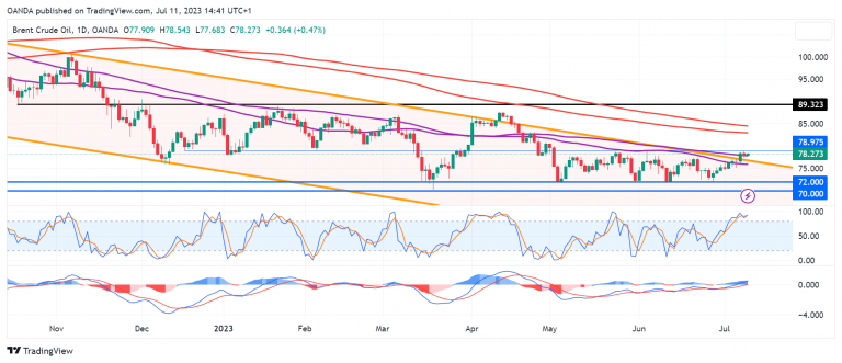 在突破6月21日的高点后,布伦特原油价格进一步走高,打破了近几个月来盘整时的一系列更低的高点结构。尽管布伦特原油仍在5月初以来的区间高位附近交投,但突破最近的高点可能被视为看涨的第一步,可能会为布伦特原油重返80美元上方提供动能。从随机指标和ACD指标上来看,油价仍有上涨动能,它们都在创造更高的高点。