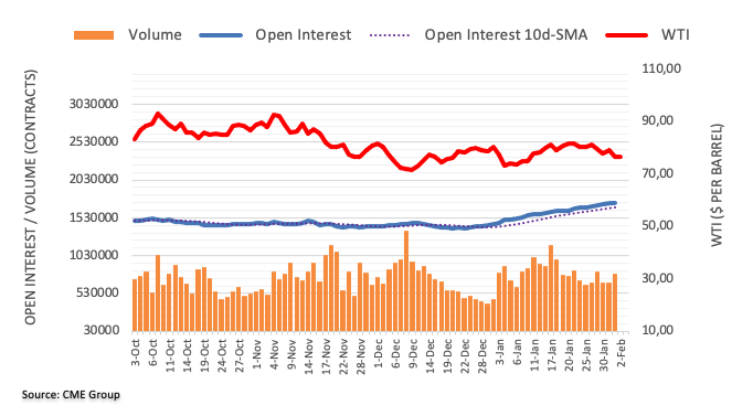 根据芝加哥商品交易所集团(CGrou)发布的原油期货市场最新数据,周三未平仓合约又增加了近3000份。与此同时,成交量延续了前一次的增长,增加了约11.12万份合约。 WTI原油可能跌至72.50美元 周三,WTI原油价格恢复本周跌势。下跌与未平仓权益和成交量的上升是同步的,表明极短期内可能会更深度回调。与此相