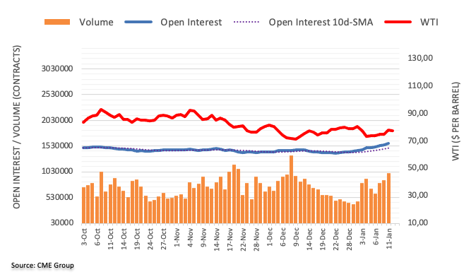芝加哥商业交易所集团原油期货市场的最新数据显示,周三交易员增持原油未平仓合约近2.2万份,延续数周的升势。与此同时,成交量连续第三日增长,目前增长约14.16万份合约。 WTI原油:下一阻力位于81.44美元 周三WTI原油价格大涨,同时未平仓合约和成交量齐增,打开了油价在超短期内继续反弹的大门。对此,下一