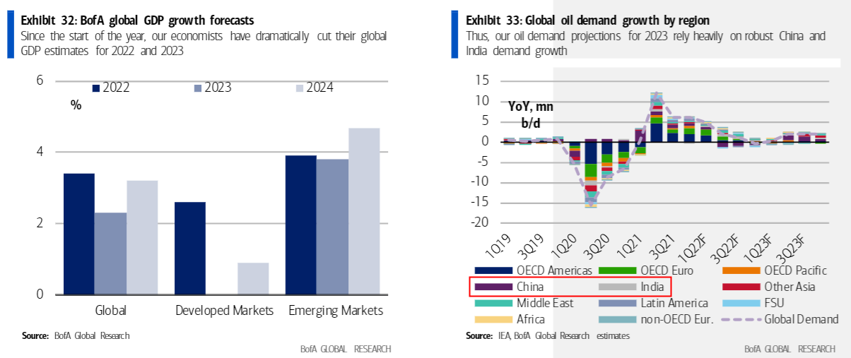 放眼全球,无论从经济还是石油需求角度来看,发达市场都将迎来一段艰难时期,这一点毫无疑问。我们的经济团队预计,2023年和2024年新兴经济体的GD增速将超过发达市场3.8%(如附图左图所示),而10年平均增速将超过2.6%。毫不奇怪,我们对2023年石油需求的预测在很大程度上依赖于中国和印度需求的强劲增长(附图右图所示