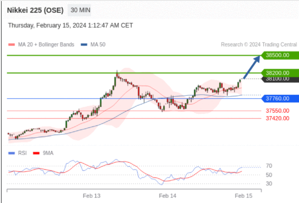 在37760.00之上,看涨,目标价位为38200.00,然后为38500.00。 转折点:37760.00 交易策略:在37760.00之上,看涨,目标价位为38200.00,然后为38500.00。 备选策略:在37760.00下,看空,目标价位定在37550.00,然后为37420.00。 技术点评:RI技术指标上,呈现新的上升趋势。 阻力位: 38690.00 38500.00