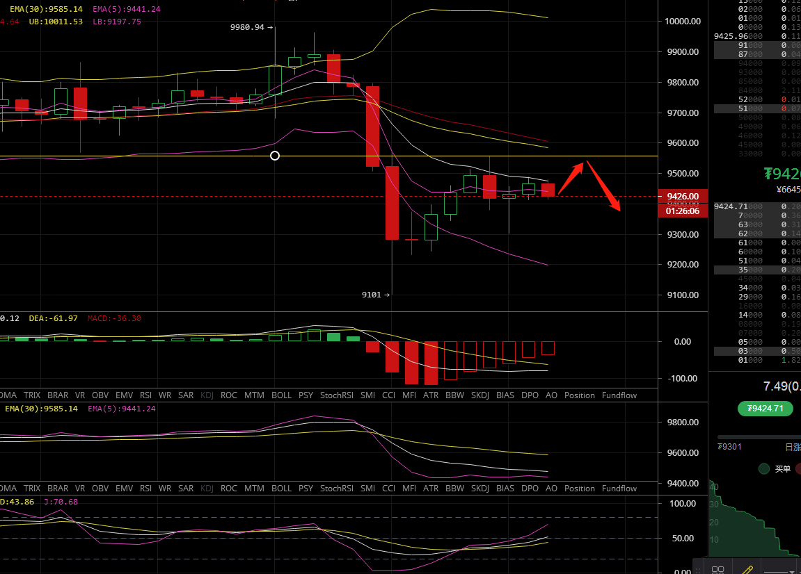 【行情回顾】 比特币昨日凌晨经过暴跌触及9101,白天是一个反弹修复,也是和凌姗预测一样,至9550压力位开始回落,今天凌晨是最低到了9301,目前处于9450一线震荡。 【行情分析】 比特币日线级别来看价格运行在布林带中轨,五日均线下穿十日均线,ACD遇阻向死叉运行,空头能量不断增