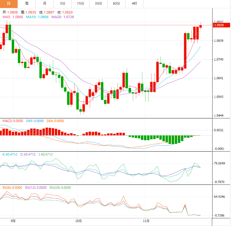 周一盘中,欧元兑美元上涨至1.0922,涨幅0.08%。 基本面上,欧元/美元周一上涨,最高曾触及1.0936,涨幅约0.2%,上周五上涨0.56%,尽管美国现货公债收益率坚挺,但美元下跌。由于人们越来越多地押注美联储明年降息,美元持续走软,这对货币对正从中获利。与此同时,谨慎乐观的市场情绪也在本周开盘清淡的情况下支撑了