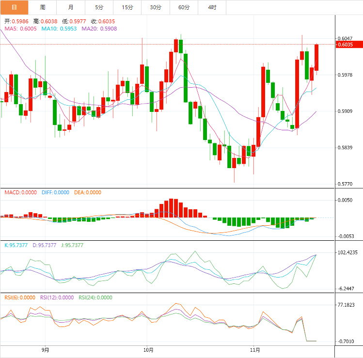 周一盘中,纽元兑美元上涨至0.6037,涨幅0.73%。 基本面上,中国人民银行(oC)选择将贷款优惠利率(LR)维持在3.45%不变,符合预期。周一亚洲交易时段,纽元兑美元在0.6020附近走高,延续了连续第二个交易日的涨幅。 技术面上,纽元兑美元倾向于A50,并强劲向上反弹,开始攻击关键阻力位0.6020,暗示在接下来的