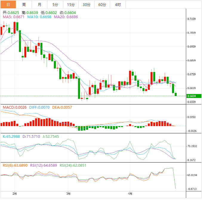 周三盘中,澳元兑美元下跌至0.6605,跌幅0.32%。 澳元基本面:在澳大利亚统计局公佈的通胀数据进一步走软后,澳元/美元不断向0.6600的整数关口支撑下跌。澳大利亚第一季度消费者价格指数(CI)上升1.4%,但低于前值1.9%。年度通胀率走软至7.0%,略高于预估的6.9%,但低于前值7.8%。月度CI指标从市场共识的6.6%和前
