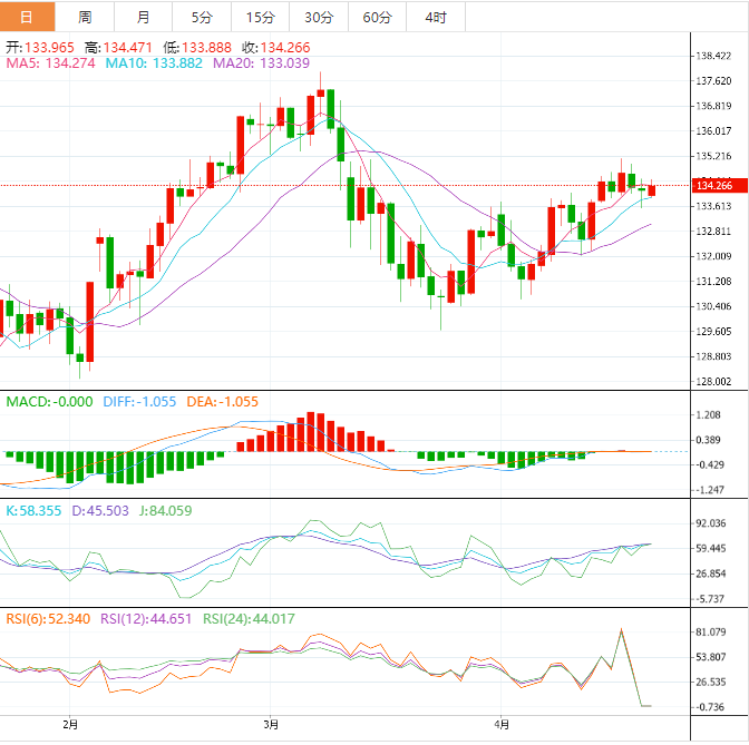周一盘中,美元兑日元上涨至134.28,涨幅0.11%。 基本面上,美元/日元正力图夺回紧邻阻力134.50。日本央行行长植田和男重申了保持货币政策扩张的必要性,美元/日元获利动能。日本央行行长植田和男强烈支持继续执行长达10年的超宽鬆货币政策,因为其预计日本的通货膨胀将提前达到峰值。 技术面上,美元兑日元在经历