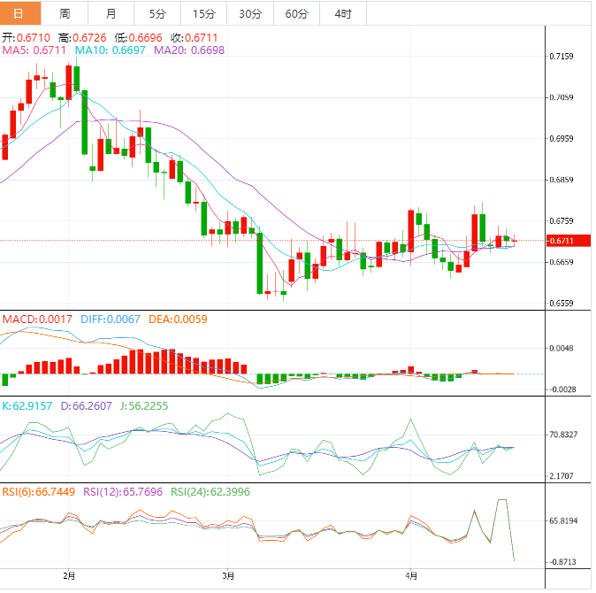 周四盘中,澳元兑美元上涨至0.6713,涨幅0.01%。 澳元基本面:澳元兑美元回落至0.6700,截至发稿时约为0.6715,因谨慎的市场的重要数据/事件之前对风险晴雨表货币对施加压力。尽管如此,在对通胀和地缘政治紧张局势的担忧中,市场普遍悲观的情绪和美国国债收益率走强,令澳元兑美元前一天承压。 澳元技术面:澳元