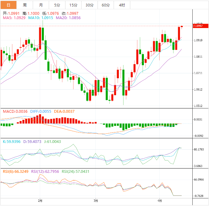 周四盘中,欧元兑美元上涨至1.0999,涨幅0.06%。 欧元基本面:欧元兑美元多头在1.0990附近暂歇,前日刷新10周高点。该货币对自3月23日以来的上行阻力线反转,同时印证相对强弱指标超买。不过ACD信号看涨以及指向下跌的多重水平令多头充满希望。 欧元技术面:欧元兑美元昨天收盘时表现明显积极,在1.1000的障碍附