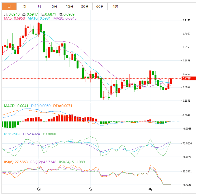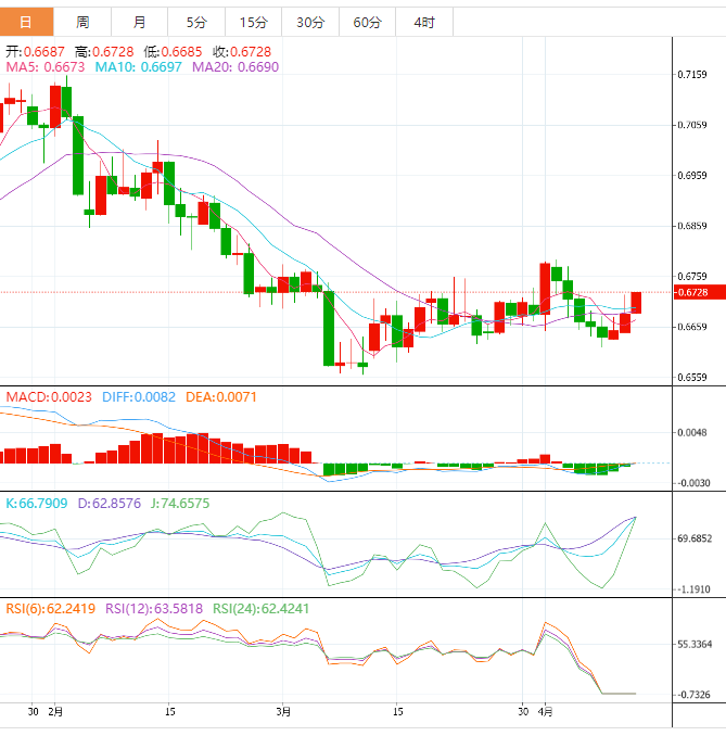 周四盘中,澳元兑美元上涨至0.6728,涨幅0.63%。 澳元基本面:由于澳大利亚统计局公佈的就业数据强劲,澳元/美元对已攀升至0.6700的整数阻力上方。澳大利亚3月份新增就业人数5.3万,高于期值2万个,但低于前值6.4万个。此外,失业率保持在3.5%不变,但低于预期3.6%。这将迫使澳大利亚储备银行(RA)重新考虑其稳定的