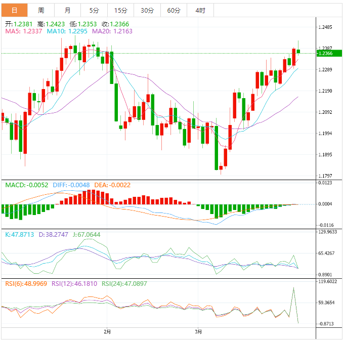 周五盘中,英镑兑美元下跌至1.2369,跌幅0.15%。 英镑基本面:周五欧市早盘公佈的英国增长数据好于预期,但英镑兑美元反映平淡。这可能是因为美联储青睐的通胀指标发布之前市场情绪谨慎。英国第四季度GD环比增长0.1%,前值0%,同比增长0.6%,前值0.4%。值得指出的是,英国3月全国房价和第四季度总的商业投资数据表现