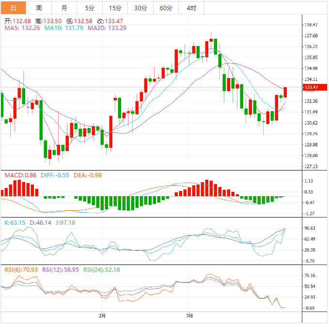 周五盘中,美元兑日元上涨至133.48,涨幅0.63%。 基本面上,美元/日元刷新两周高点后下跌至132.90,市场情绪在关键的美国通胀数据公佈前恶化。围绕日本央行的传闻、日本数据良莠不齐以及美国国债收益率疲软加剧其回调行情。日本3月东京消费者物价指数(CI)上升3.3%,前值3.4%,预期2.7%,而剔除食品和能源价格的核
