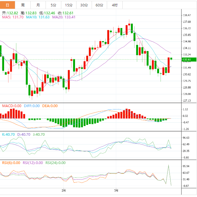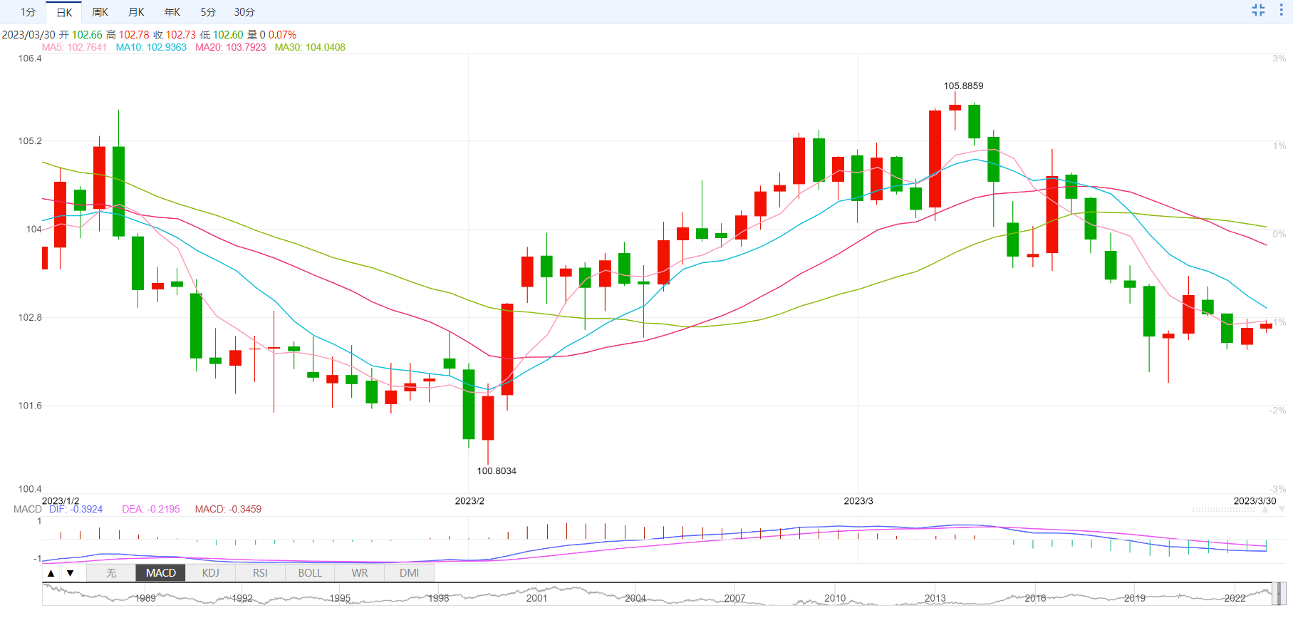 今日外汇市场走势分析 周四亚洲时段,美元指数窄幅震荡,目前交投于102.76附近。美元兑大多数主要货币周三上涨,扭转了近期的一些跌势,因为对银行业担忧情绪的缓解,避险日元遭遇抛售,美元兑日元周三大涨近200点,至132.84附近,在日本财政年度即将结束之际,日元走势动荡。 美元兑加元周三表现不佳,盘中一度创