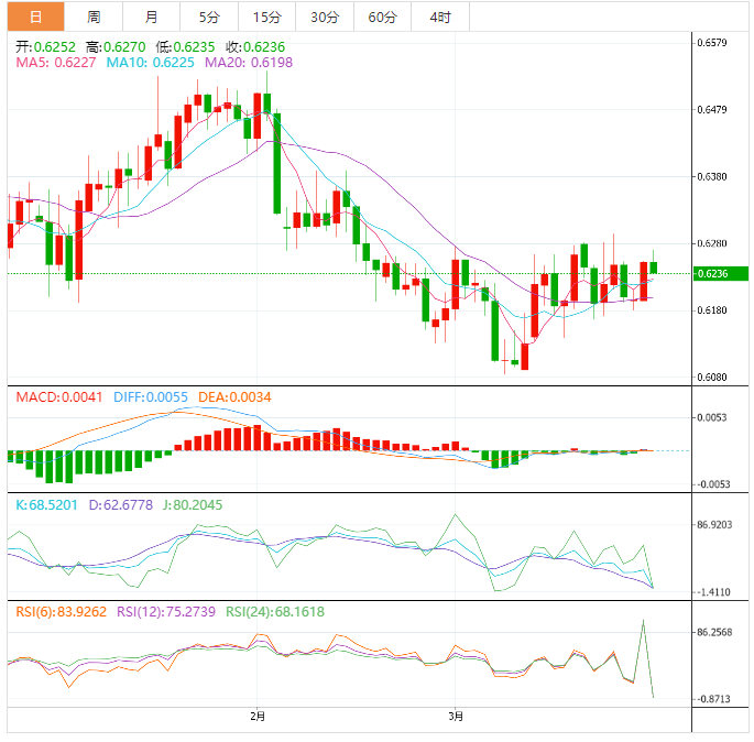 周三盘中,纽元兑美元下跌至0.6237,跌幅0.26%。 基本面上,纽元/美元突破0.6260后举步维艰。美元指数出现反弹处在102.40附近,纽元/美元正面临阻力。美元指数在102.40附近获得间中支撑,然而,由于投资者对美联储(FD)将在5月作出的利率决定持不同看法,因此美元下跌倾向还没有消退。 技术面上,纽元兑美元继续
