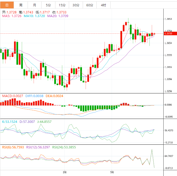 周一盘中,美元兑加元下跌至1.3734,跌幅0.04%。 加元基本面:美元/加元在亚市录得当日新低1.3725。其下行可能受到美元疲软以及加央行重启加息希望在强劲的加拿大零售销售数据公佈后上升的推动。在加元方面,乐观的零售销售(2月)数据提高了加拿大央行(oC)恢复政策紧缩的可能性。今年年初,加拿大央行宣布停止加