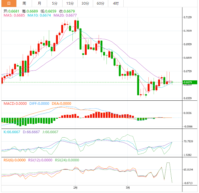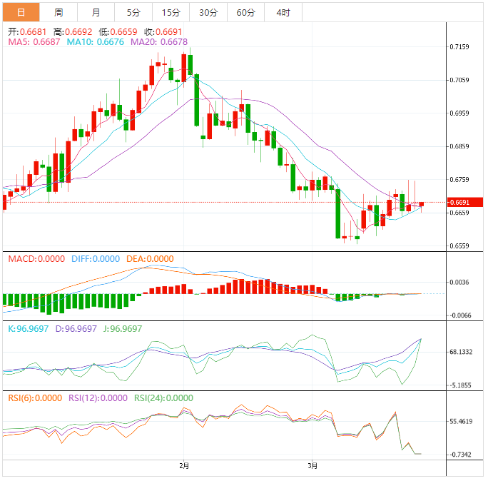 周五盘中,澳元兑美元上涨至0.6692,涨幅0.15%。 澳元基本面:澳元/美元三日内首日下跌,处在0.6670附近,有望周线收跌。在这期间,澳元/美元验证其风险晴雨指标的地位,以及澳大利亚国内经济数据低迷。当天早些时候,澳大利亚3月份标准普尔全球採购经理人指数初值降至荣枯线50.00以下,不及市场预期和前值。也就是说