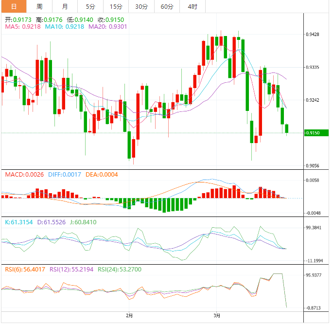 周四盘中,美元兑瑞郎下跌至0.9152,跌幅0.25%。 基本面上,美元/瑞郎录得三连跌,处于一周以来的最低水平附近,美元/瑞郎下跌0.25%,在0.9155附近,美元/瑞郎空头走强,准备迎接瑞士央行利率决议。 技术面上,美元兑瑞郎昨天以明显的负面走势交易,成功实现了我们的第一个目标0.9150,并稳定在该水平附近,等待进