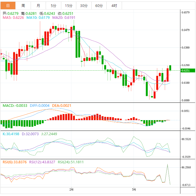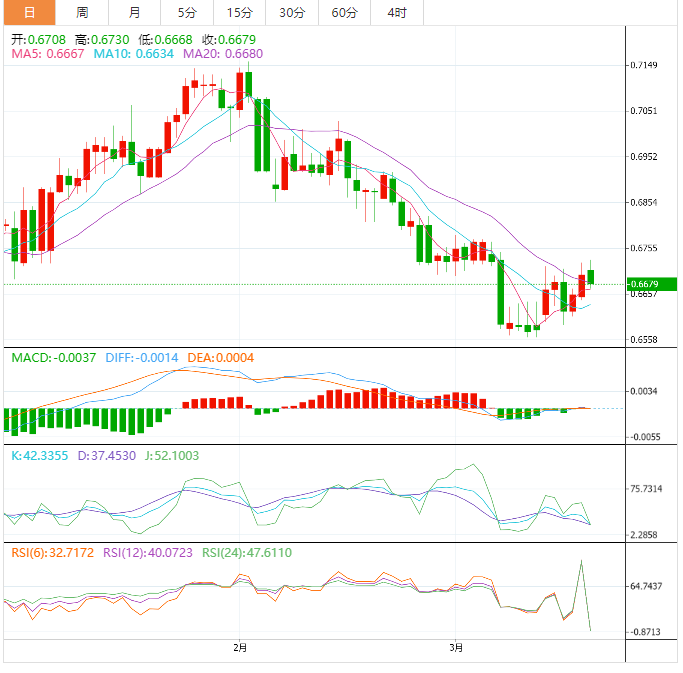 周一盘中,澳元兑美元下跌至0.6681,跌幅0.25%。 澳元基本面:澳元/美元风险偏向于上涨,但继触及高位0.6730关口后回落。目前澳元/美元波动不大。亚市盘初,在主要央行针对流动性紧缩採取联合措施的背景下,风险偏好扩大,一些高风险货币上涨。澳储行助理行长克里斯托弗·肯特(ChritohrKt)早些时候表示,澳储行