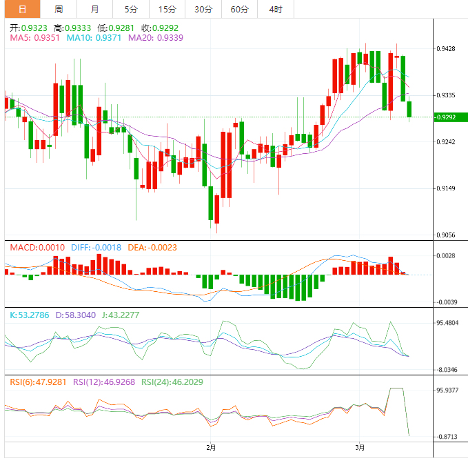 周五盘中,美元兑瑞郎下跌至0.9297,跌幅0.30%。 基本面上,瑞士货币(CHF)对描绘了一个被称为“双顶”的看跌图表,标志着未能突破0.9440的障碍。与此同时,看跌的ACD信号也令该货币对卖方保持希望。日内关注非农数据,或将影响瑞郎走势。 技术面上,美元兑瑞郎昨天以明显的负向交易,并在0.9316附近结束交易,注