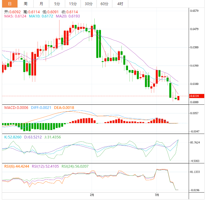 周五盘中,纽元兑美元上涨至0.6115,涨幅0.25%。 基本面上,在新西兰方面,中国疲弱的消费者价格指数(CI)数据表明,尽管重启措施,但中国经济的内需并未出现预期的复苏。值得注意的是,新西兰是中国的主要贸易伙伴之一,中国需求下降可能会削弱新西兰的出口,并最终影响新西兰元。 技术面上,在前几个交易日测试0