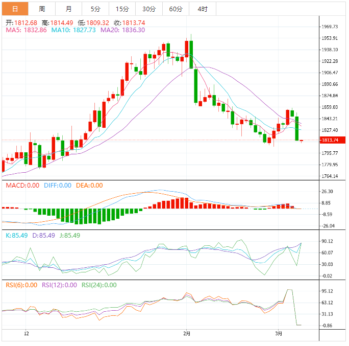 黄金价格走势综述 周四盘中,黄金交投于1813.09附近,金价周三企稳,前一交易日曾因美元上涨而下跌近2%,美联储主席鲍威尔发出进一步加息信号,削弱了对无收益黄金的需求。鲍威尔周三重申了关于峰值利率更高,加息步伐可能更快的信息,但强调仍在进行讨论,决策将取决于两周后联储政策会议前发布的数据。 日内,关
