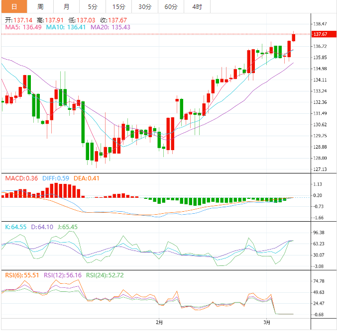 周三盘中,美元兑日元上涨至137.68,涨幅0.38%。 基本面上,美元/日元多头佔据主导。在这期间,美元/日元上涨至2022年12月中旬以来的最高水平后,整理于137.40-50区域附近。根据周三早些时候公佈的路透社最新调查,“日本央行(oJ)将在今年结束其长期收益率控制政策。” 技术面上,美元兑日元在倚靠图表上的看涨