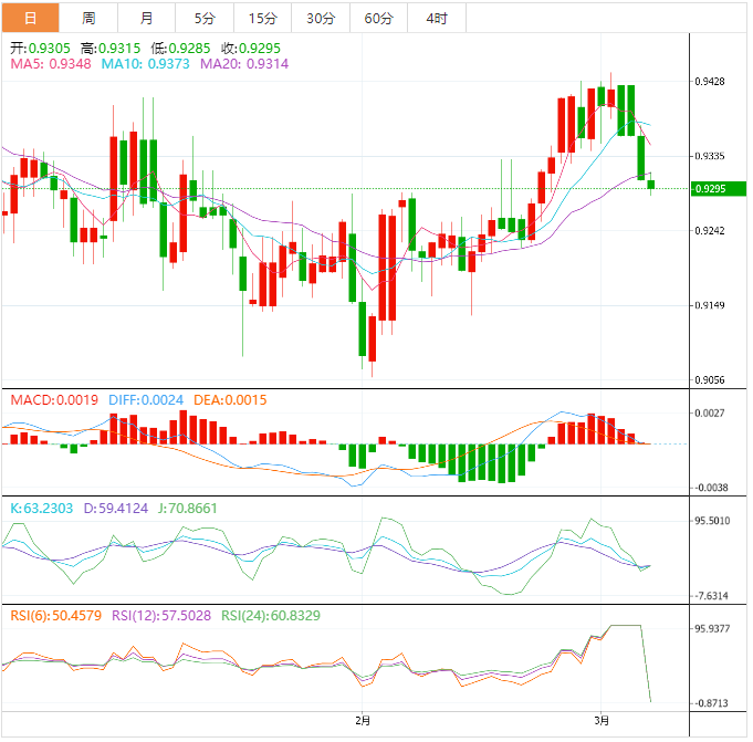 周二盘中,美元兑瑞郎下跌至0.9297,跌幅0.12%。 基本面上,美国近期公布的经济数据来看,美国服务业较制造业更为强劲,就业市场也彰显经济韧性仍十足,美联储实施更多加息的预期也越发强烈。但上周美元指数整体维持整理,当周跌0.66%,结束五周连涨。从周二开始,美联储主席鲍威尔将先后出席参议院银行委员会和众议