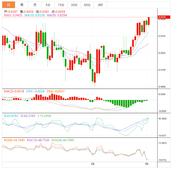 周四盘中,美元兑瑞郎上涨至0.9441,涨幅0.45%。 基本面上,瑞士1月零售销售可以指引美元兑瑞郎短期波动,然后为米国1月活动数据。不过主要焦点将是下週的月度就业报告,美联储主席鲍威尔作证和FOC会议以带来明确指引。 技术面上,美元兑瑞郎出现了新的积极交易,以支持在盘中继续看涨趋势的预期,最初的目标是0