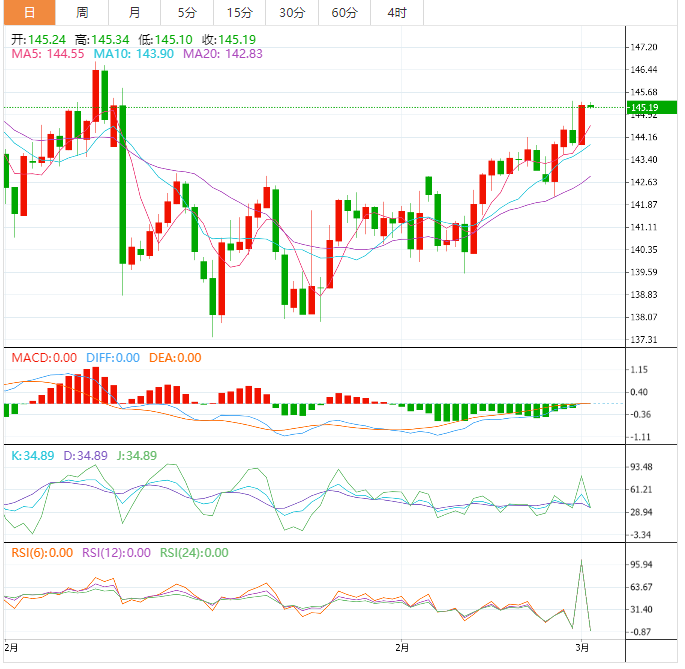 周四,欧元兑日元在东京早盘逐渐接近关键阻力位145.50。在德国消费者价格协调指数(HIC)(2月)数据意外上升后,该交叉盘从144.00下方稳步反弹。年度HIC初值跃升至9.3%,高于此前公布的9.0%的普遍预期和9.2%的数据。从月度来看,德国HIC上升了1%,而预期为0.7%。 德国通胀意外上升,增强了欧洲央行进一步加息的