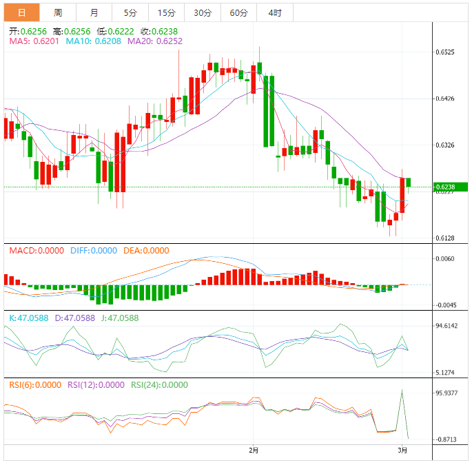纽元兑美元下跌了约0.27%,从0.6257的高点跌至0.6238的低点,回吐了周中在数据显示中国需求复苏提振大宗商品价格后的部分涨幅。 在此之前,澳大利亚的数据表现不佳,澳大利亚的国内生产总值(gd)环比增长放缓至0.5%,此前为0.7%,而普遍预期为上升0.8%。这一数据增加了澳大利亚央行(RrvakofAutralia)稍早暂停