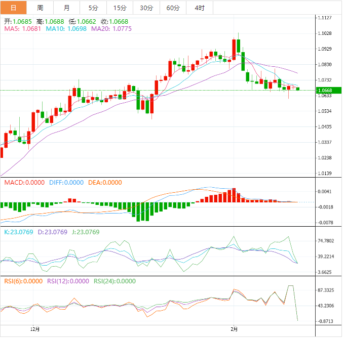 周二盘中,美元指数上涨至103.98,涨幅0.09%;欧元兑美元下跌至1.0673,跌幅0.10%;英镑兑美元下跌至1.2028,跌幅0.07%;美元兑日元上涨至134.32,涨幅0.05%;澳元兑美元下跌至0.6892,跌幅0.25%。 欧元兑美元亚洲盘走低,市场寻找新的指引 欧元兑美元周一收盘跌0.08%,报1.0685,受到美国假期影响,整体波动较小