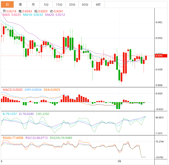 周三盘中,美元兑瑞郎上涨至0.9242,涨幅0.27%。 基本面上,美元/瑞郎企稳于0.9225附近,并刷新盘中高点。在这期间,美元/瑞郎延续前日自一周最低水平反弹的势头,构筑为期一周的看涨三角形形态。美元/瑞郎目前上涨目标是上述三角形形态顶部最新处在0.9250附近。 技术面上,美元兑瑞郎在图表上出现的看跌通道的阻