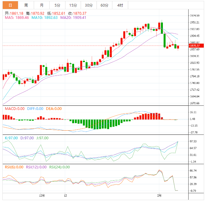 黄金价格走势综述 周一,现货黄金震荡微跌,目前交投于1861.00美元/盎司附近,美国劳工部上修了美国12月份的CI数据,给美元提供支撑,美债收益率升至逾一个月高位,令金价承压。技术面显示,金价后市偏向震荡下行。调查显示,多数分析师倾向于看空黄金后市。美国政策制定者的乐观情绪可能会增强黄金空头的信心,包括