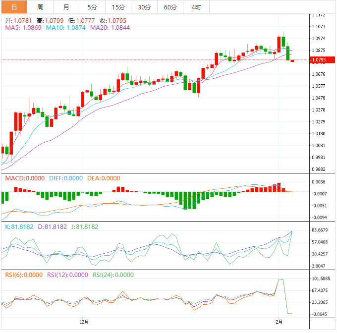 周一盘中,美元指数上涨至103.03,涨幅0.04%;欧元兑美元1.0795,涨幅0.01%;英镑兑美元上涨至1.2064,涨幅0.09%;美元兑日元上涨至131.70,涨幅0.41%;澳元兑美元上涨至0.6946,涨幅0.41%。 欧元兑美元继周五大跌后略微企稳 欧元兑美元周一亚洲盘略微持稳,在1.0777-1.0798区域震荡;上周五汇价1.07%,最低触及1.