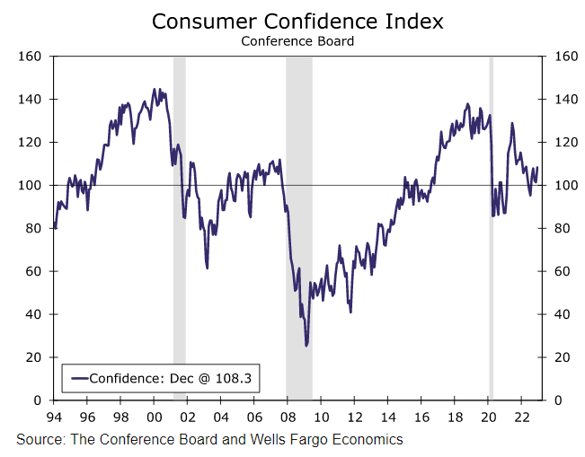 周二23:00美国1月谘商会消费者信心指数 尽管基本预期是美国经济今年将陷入温和衰退,但这个全球最大经济体还是有一条可行的道路可以避免衰退,尽管这条道路有些令人担忧。这将归结于预期中的就业数据疲软将维持消费者支出。 要了解劳动力对消费者心态的影响,关键是世界大型企业联合会(Cofrcoard)的消费者信