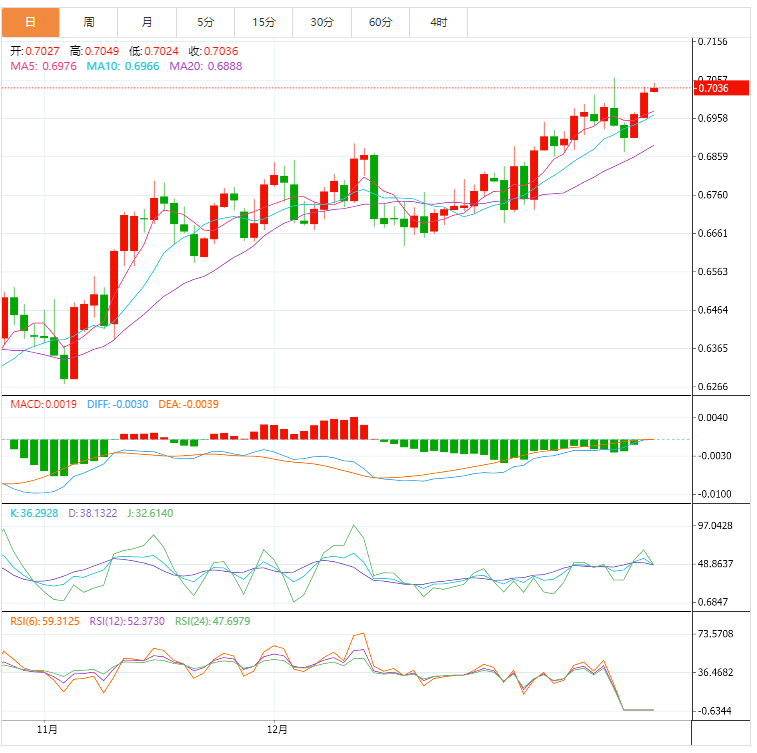 周二盘中,澳元兑美元上涨至0.7038,涨幅0.19%。 澳元基本面:澳元/美元多头连续第三日维持在0.7030-35附近。在这期间,澳元/美元处在为期一周的上升趋势通道内,同时验证相对强弱指标(14)更为坚挺。根据标准普尔I(1月)初值,澳大利亚制造业I连续7个月下调至49.8,而市场预期将扩张至50.3。此外,服务业I从普遍