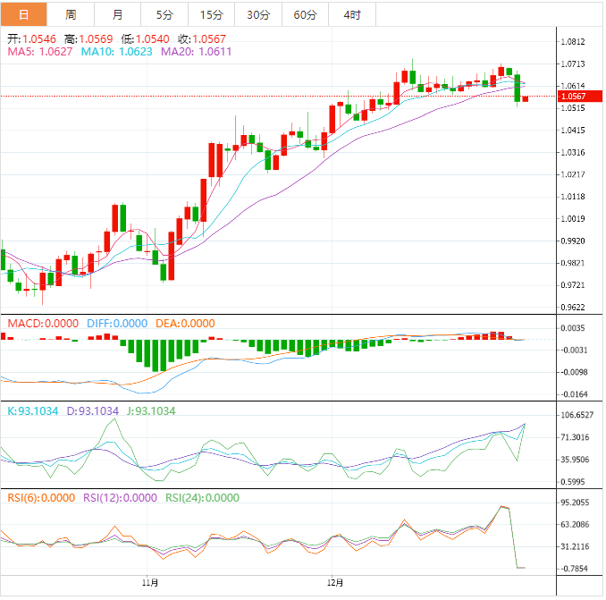 今日外汇市场走势分析 周三盘中,美元指数窄幅震荡,目前交投于104.47附近。守住了隔夜大部分涨幅。美元周二跳涨0.9%,盘中一度创逾两周新高至104.86,收报104.68,美国11月建筑支出意外反弹,而且欧元因通胀缓和下跌,美联储将于周三纽约时段发布12月会议记录。 美元兑一篮子货币盘尾上涨0.91%,收报104.68,为近