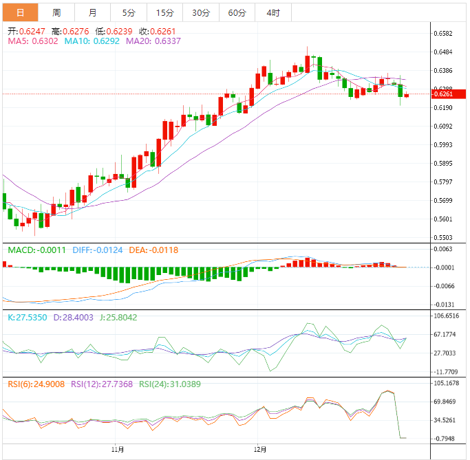 周三亚洲时段早盘,纽元兑美元在关键障碍0.6250下方震荡。受避险情绪影响,新西兰元刷新月度低点0.6200后强劲反弹。在美国I制造业I和联邦公开市场委员会(FOC)会议纪要公布之前,投资者更倾向于将资金配置到避险资产,以规避波动。 美元指数在测试了约103.10的15日低点后表现出更强劲的反弹,抛售压力减少,推动