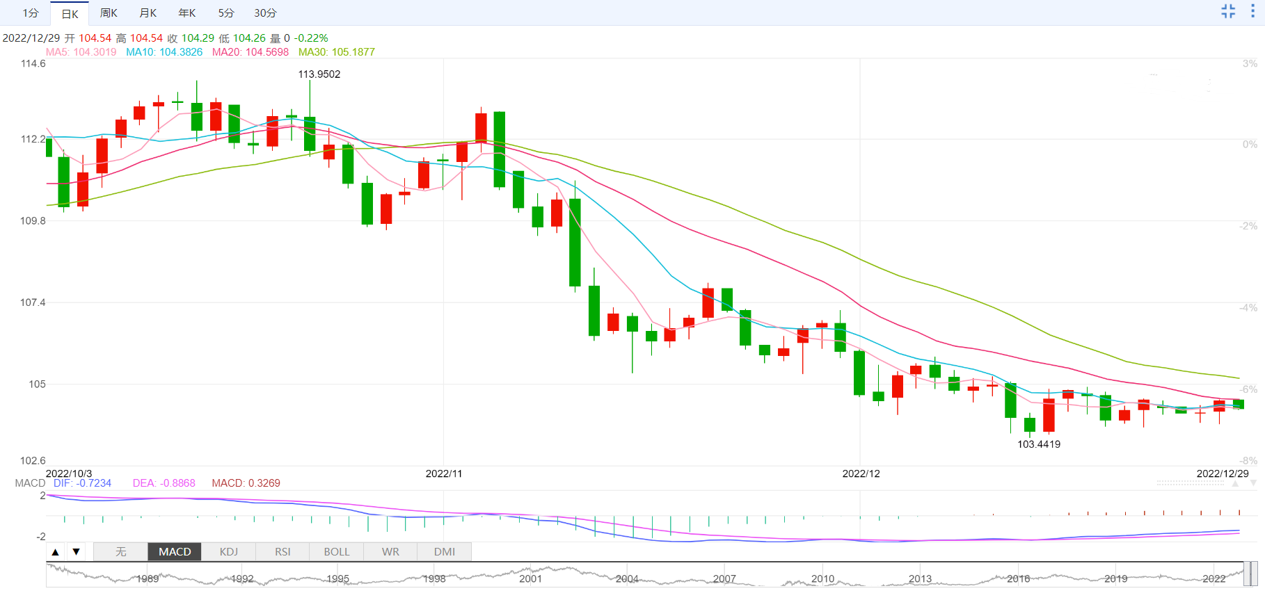 今日外汇市场走势分析 周四盘中,美元指数窄幅震荡,目前交投于104.28附近。周三美元指数上涨0.3%,收报104.52;美元兑日元周三触及一周高点,为连续四个交易日上涨,受美债收益率跳升和投资者预期中国经济增长将因新冠防控措施放松而反弹提振。欧元兑美元周三下跌0.25%,收报1.0611美元,在欧洲央行行长拉加德表示需