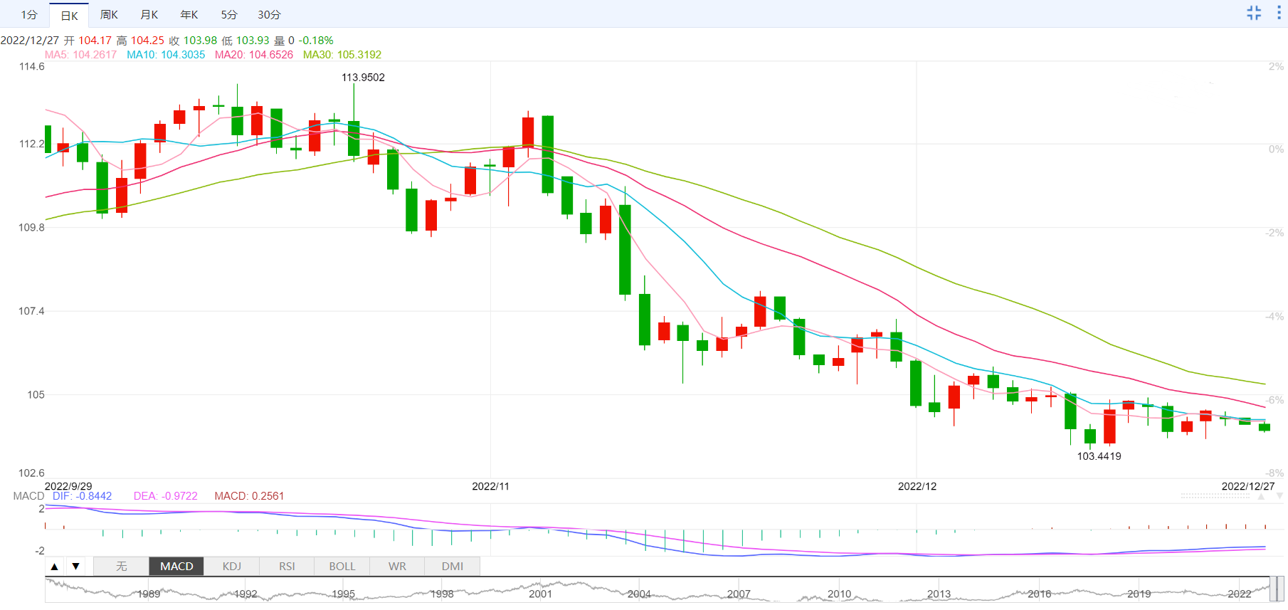 黄金价格从盘中高点1807美元附近回落,因多头等待欧洲周二盘前假日交易清淡的更多线索。金价最新回调可能与美元指数从盘中低点反弹,以及悲观的中国数据有关。 黄金市场基本面综述 美元指数盘整盘中的损失,从日低点103.95反弹。即便如此,美元兑六种主要货币的指数仍连续第三天为负。 另一方面,中国工业利润