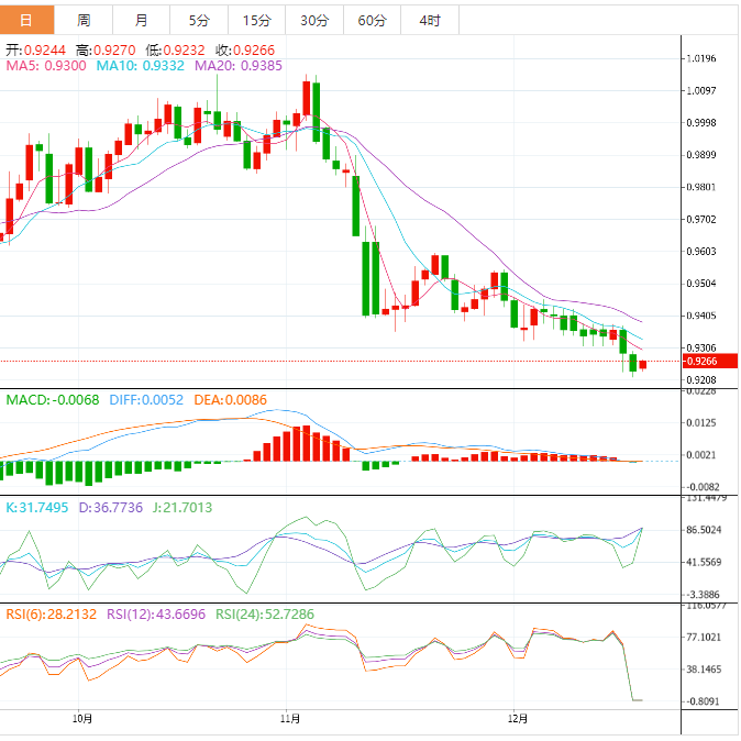 周四盘中,美元兑瑞郎上涨至0.9268,涨幅0.25%。 基本面上,美元/瑞郎整理于9个半月以来最低水平,美元/瑞郎创下三日以来的首日上涨,整理于0.9250附近。瑞郎波动表明在瑞士央行()货币政策会议之前,正整理近期跌幅。继美联储决议后,美元/瑞郎整理于9个半月低位0.9250附近,关注瑞士央行决议。 技术面上,美元