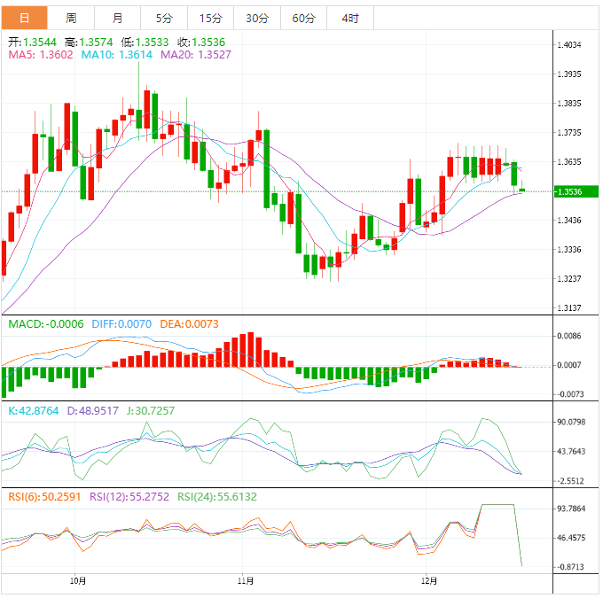 周三盘中,美元兑加元下跌至1.3537,跌幅0.07%。 加元基本面:美元/加元在1.3575附近刷新盘中高点,接近本周低点整理近期跌势。在美联储货币政策会议召开之前,市况清淡之际,该货币对录得三日内首日盘中上涨,同时逆转前一日大跌。展望未来,加拿大10月制造业销售可能会推在关键的FOC会议前推动美元兑加元交易员,