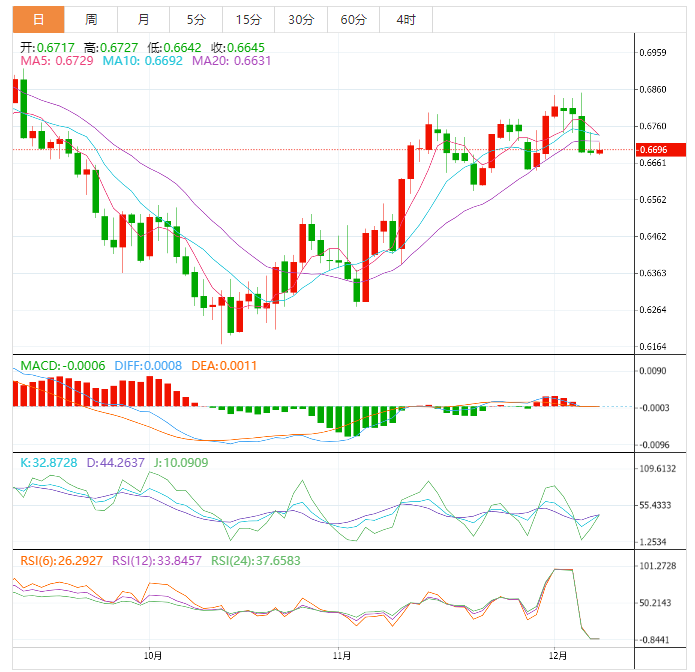 周三盘中,澳元兑美元上涨至0.6698,涨幅0.16%。 澳元基本面:各大银行的主要代表和彭博经济学家对全球经济衰退的担忧,似乎对澳元/美元多头构成挑战。此外,澳大利亚第三季度国内生产总值(GD)低于预期,中国11月月度贸易数据表现不佳,也对澳元/美元的价格造成不利影响。展望未来,在周四的中国通胀数据和周五的美