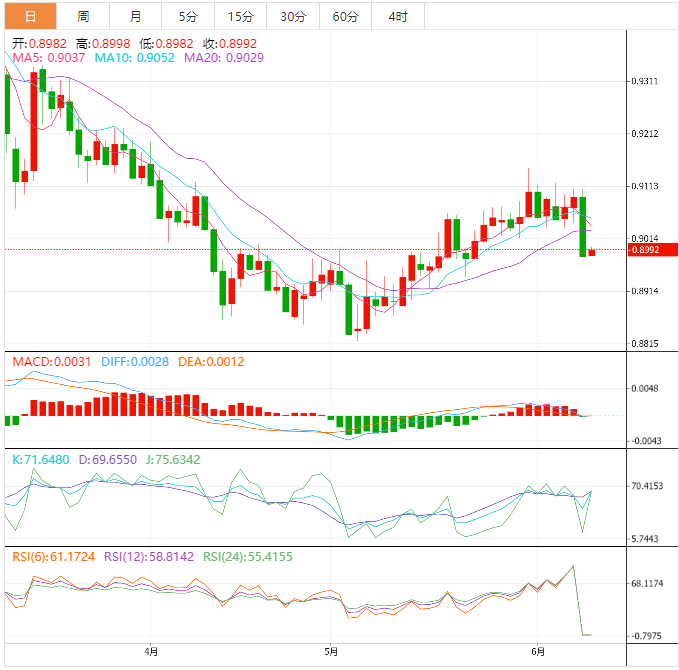 周五盘中,美元兑瑞郎上涨至0.8994,涨幅0.13%。 基本面上,美元/瑞郎的跳水走势背后的力量也来自于瑞士国家银行()央行Thoa.JJorda。Jorda表示,将瑞士的通货膨胀率提高到价格稳定的水平真的很重要。"他进一步补充说,等待通货膨胀率上升后再提高利率不是一个好主意。投资者应注意,已经将利率提高到1