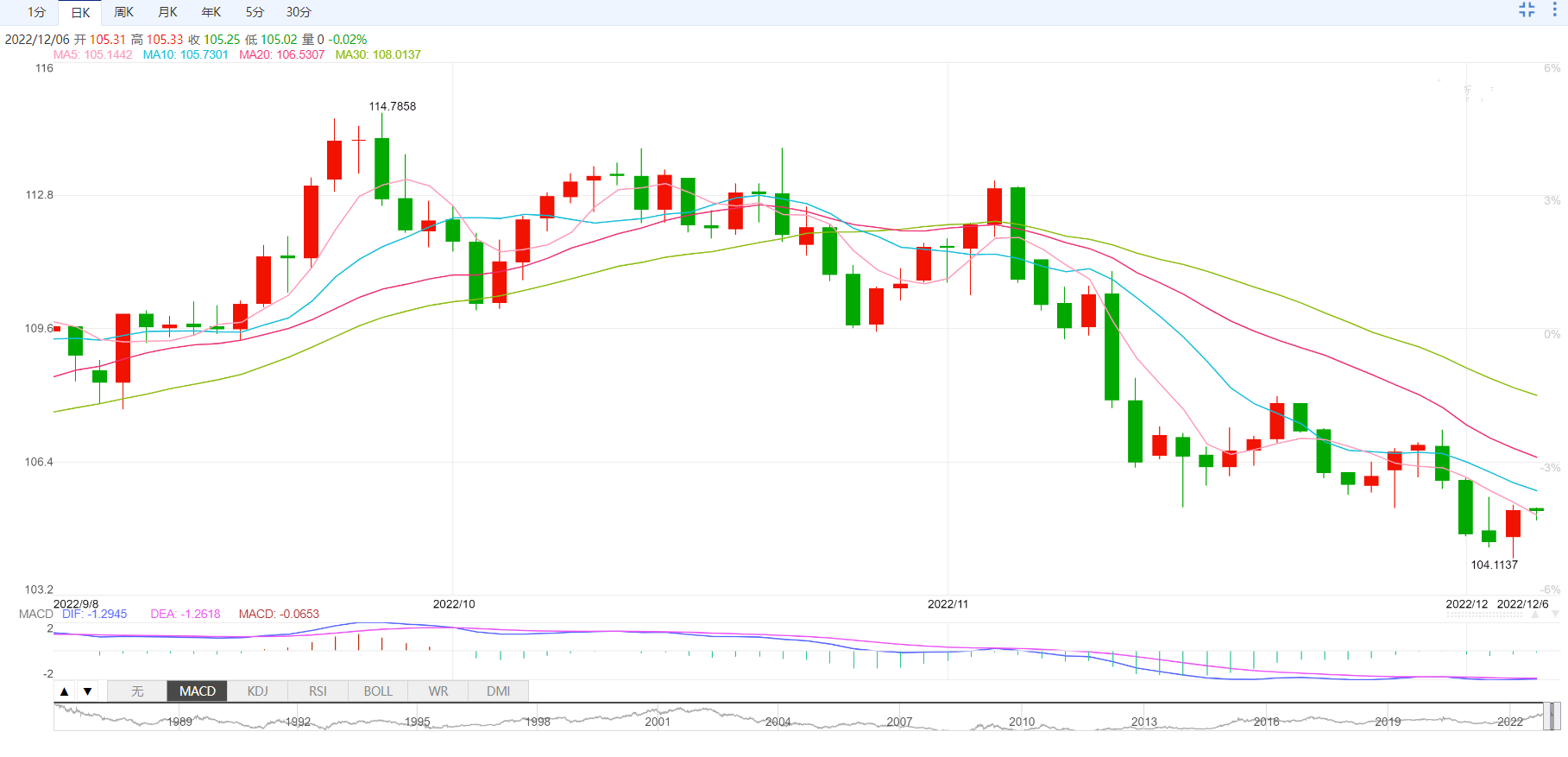 周二盘中,美元指数从去年11月下跌周期的低点104.11上升后,已回到105区域。数据显示,美国服务业活动在11月意外上升,导致人们猜测美联储可能会比最近预期的加息更多,美元因此走高。 本周初,有关美联储(fd)可能无法在12月就采取转向政策的猜测再度升温,推动了外汇市场的走势。 美国主要股指收盘下跌,这对东