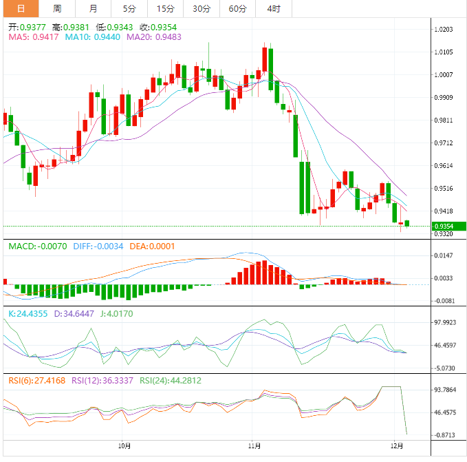 周一盘中,美元兑瑞郎下跌至0.9356,跌幅0.15%。 基本面上,美联储官员讲话称将放缓加息速度,美元/瑞郎加速自0.9530下跌,下跌170点。儘管美元/瑞郎大幅跳水,但9期波动率(ROC)和相对强度指标显示,空头正在积聚势头,加大汇价看跌倾向。美国经济前景黯淡,美元/瑞郎连续两天扩大跌幅。因此,美元走弱,与瑞郎方向相