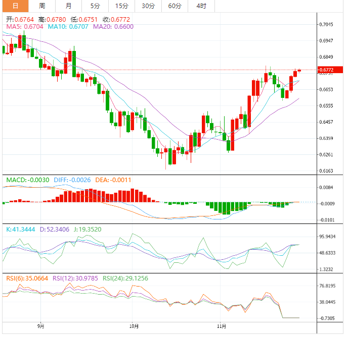 澳元延续了连续三天的涨势,并在周四收复了0.6700,这是由于美联储11月的会议记录,美元(UD)对大多数八国货币大幅贬值。由于美国感恩节的庆祝活动,澳元兑美元在周五交易清淡的交易日中触及日低点0.6726后,目前交易于0.6764。 澳元兑美元汇率走势基本面解读 美联储公开市场委员会(FOC)会议纪要的公布令美元承压