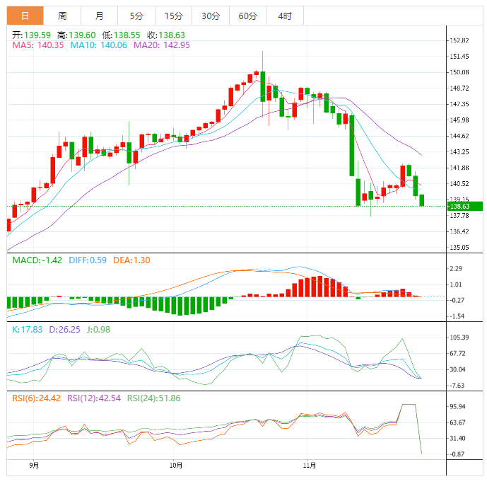 周四盘中,美元兑日元下跌至138.63,跌幅0.68%。 基本面上,美元/日元连续两日延续跌势,并跌破100日指数移动平均线(A),美元/日元倾向于中性至下行的前景得到巩固,尽管美元/日元仍处在200日指数移动平均线上方。因此美元/日元交投于139.83,处在开盘水平0.96%下方。美联储11月会议的会议记录显示,该央行的多数政