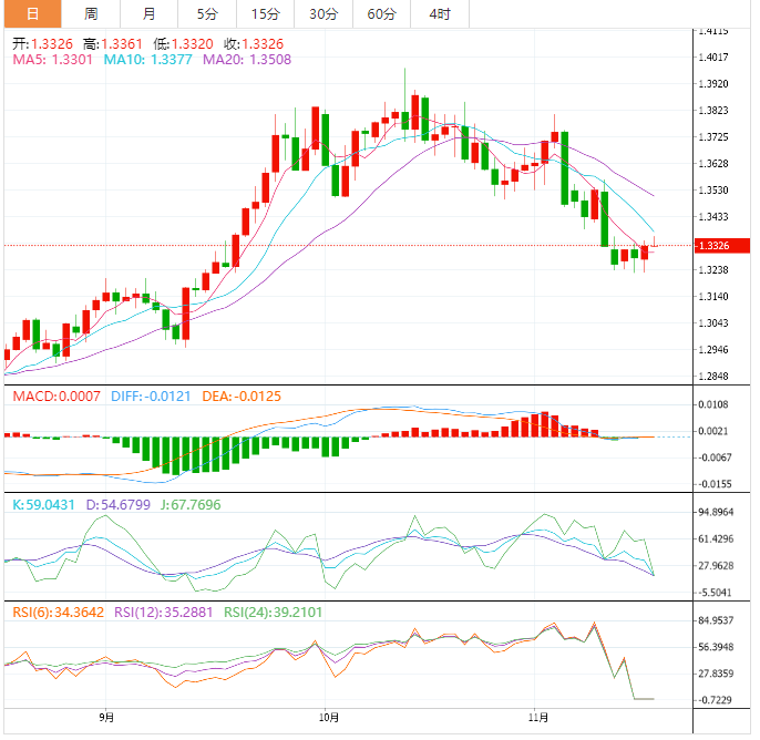 周四盘中,英镑兑美元上涨至1.1938,涨幅0.20%。 英镑基本面:英镑兑美元在1.1880附近削减三日内首日跌势。汇价反弹脱离盘中低点,但依然看空,同时14天相对强弱指标录得看跌背离。汇价录得更高低点和RI相背离,加上连续三日录得更低的高点令英镑兑美元空头充满希望,交易员等待英国秋季声明。英国央行行长安德鲁?贝