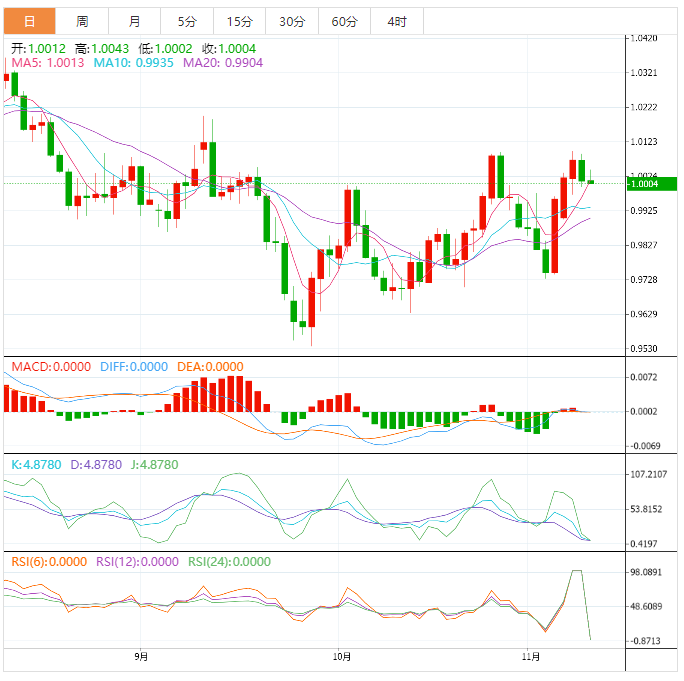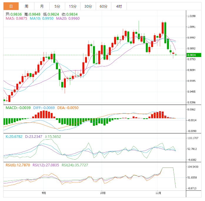 周四盘中,美元兑瑞郎上涨至0.9837,涨幅0.01%。 基本面上,美元兑瑞郎延续前一日自两週前的支撑区域0.9870以来的反弹行情。汇价徘徊于自上週五以来的下降阻力线附近。汇价成功自短期关键支撑区域0.9840附近反弹,加上最新ACD看跌倾向减弱,美元兑瑞郎价格可能继续上涨。 技术面上,美元兑瑞郎成功触及了等待目标