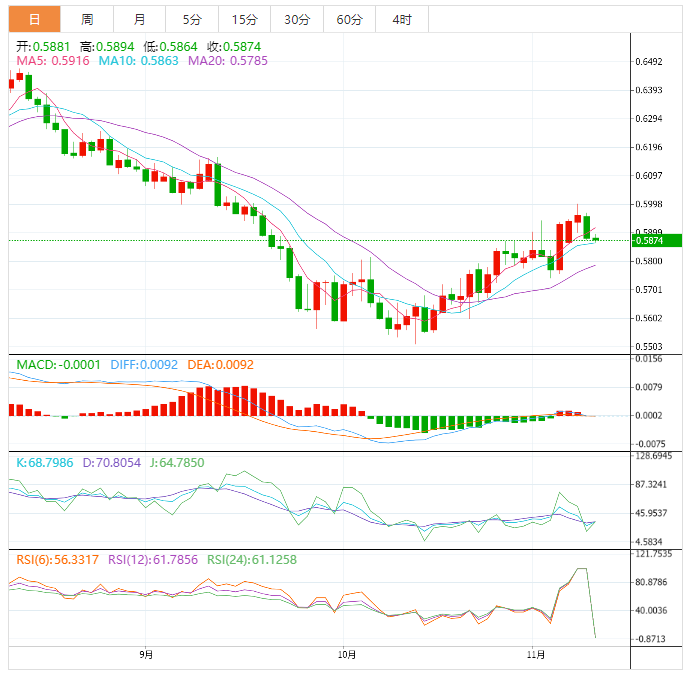 周四盘中,纽元兑美元下跌至0.5874,跌幅0.15%。 基本面上,美元疲弱,但纽元兑美元未获提振,欧市盘前,纽元兑美元维持承压于0.5865附近。纽元兑美元自期权市场以及纽储行悲观信号中获得线索。纽元兑美元一个月风险逆转率,即关键的期权市场指标录得-0.025,有望录得六个星期以来的最大周线跌幅。值得注意的是,风险
